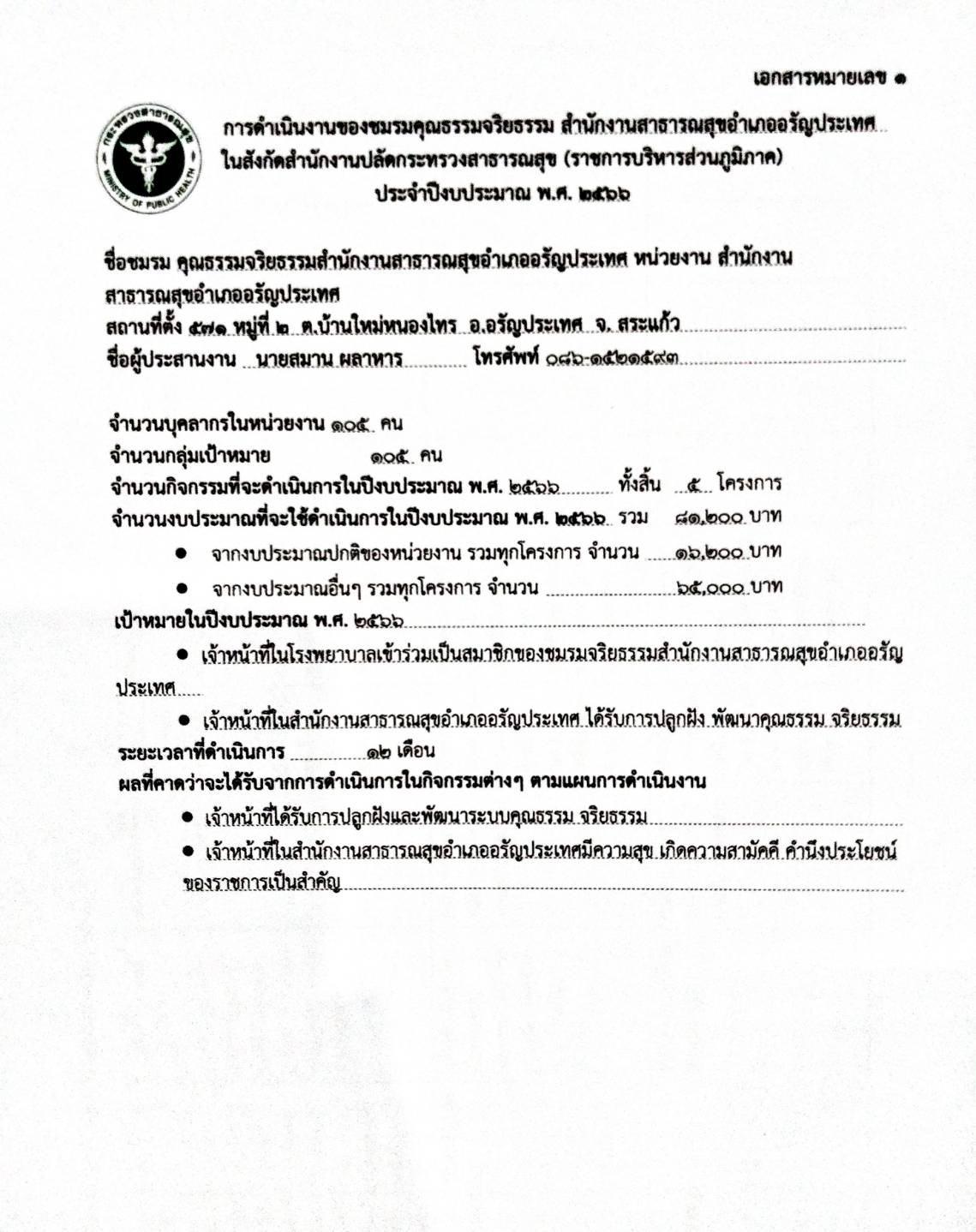 2 แผนการดำเนินงานของชมรมคุณธรรมจริยธรรม สำนักงานสาธารณสุขอำเภออรัญประเทศ ประจำปีงบประมาณ 2566 เพื่อให้ผู้ผู้บริหารและบุคลากรสำนักงานสาธารณสุขอำเภออรัญประเทศ ยึดถือเป็นแนวทางปฏิบัติ