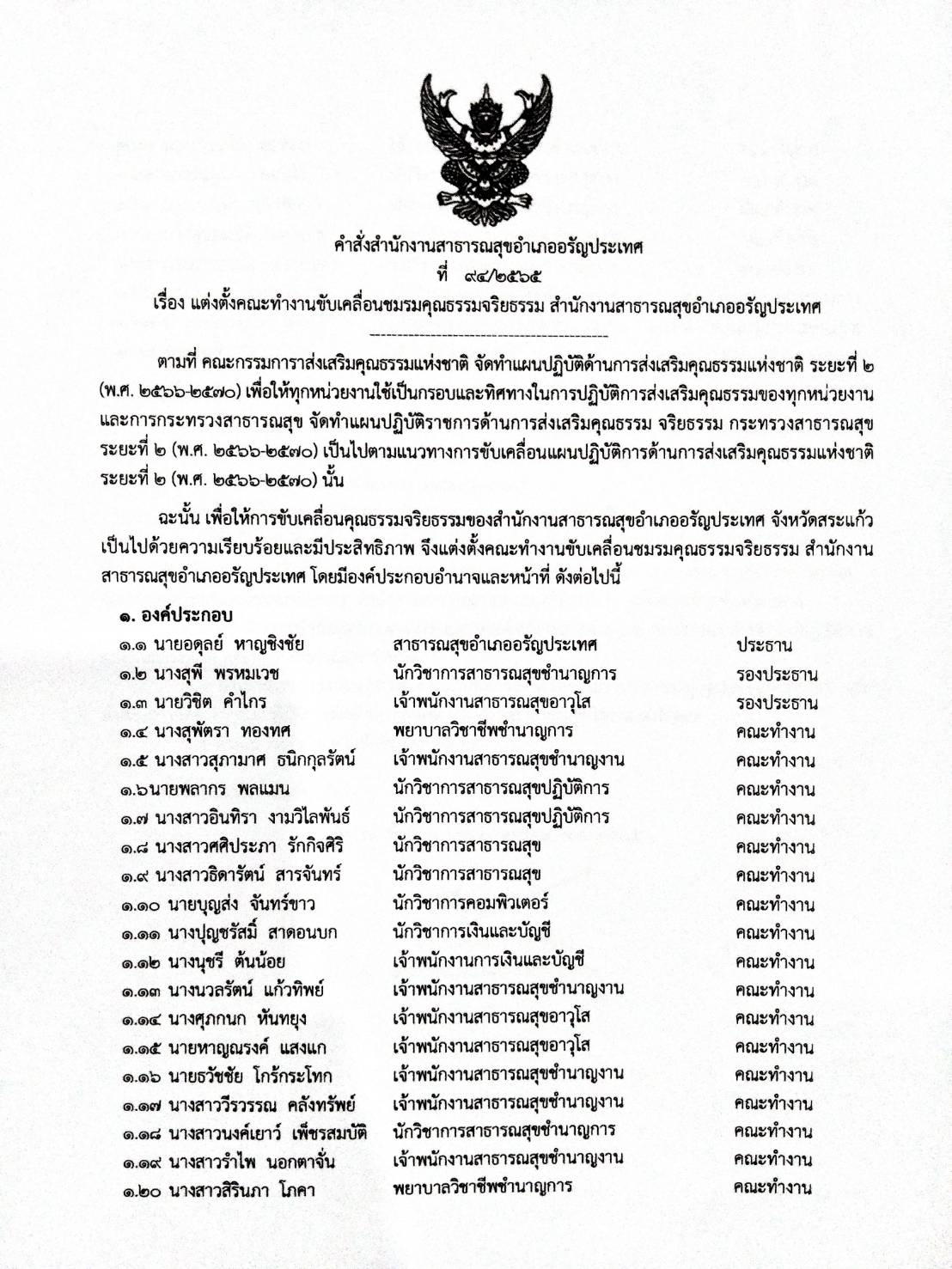 1 คำสั่งแต่งตั้งคณะทำงานขับเคลื่อนชมรมคุณธรรมจริยธรรม สำนักงานสาธารณสุขอำเภออรัญประเทศ พ.ศ. ๒๕66