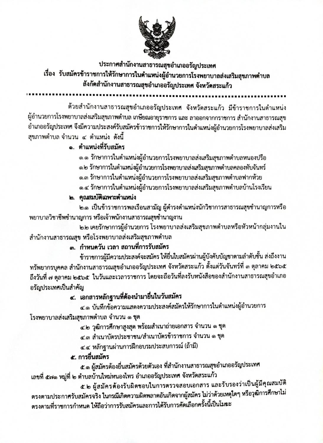 ในสังกัดสำนักงานสาธารณสุขอำอรัญประเทศ จังหวัดสระแก้ว จำนวน 4 ตำแหน่ง
