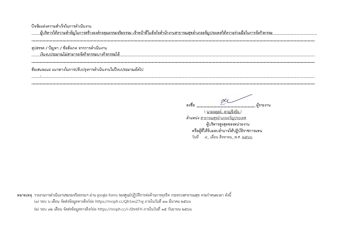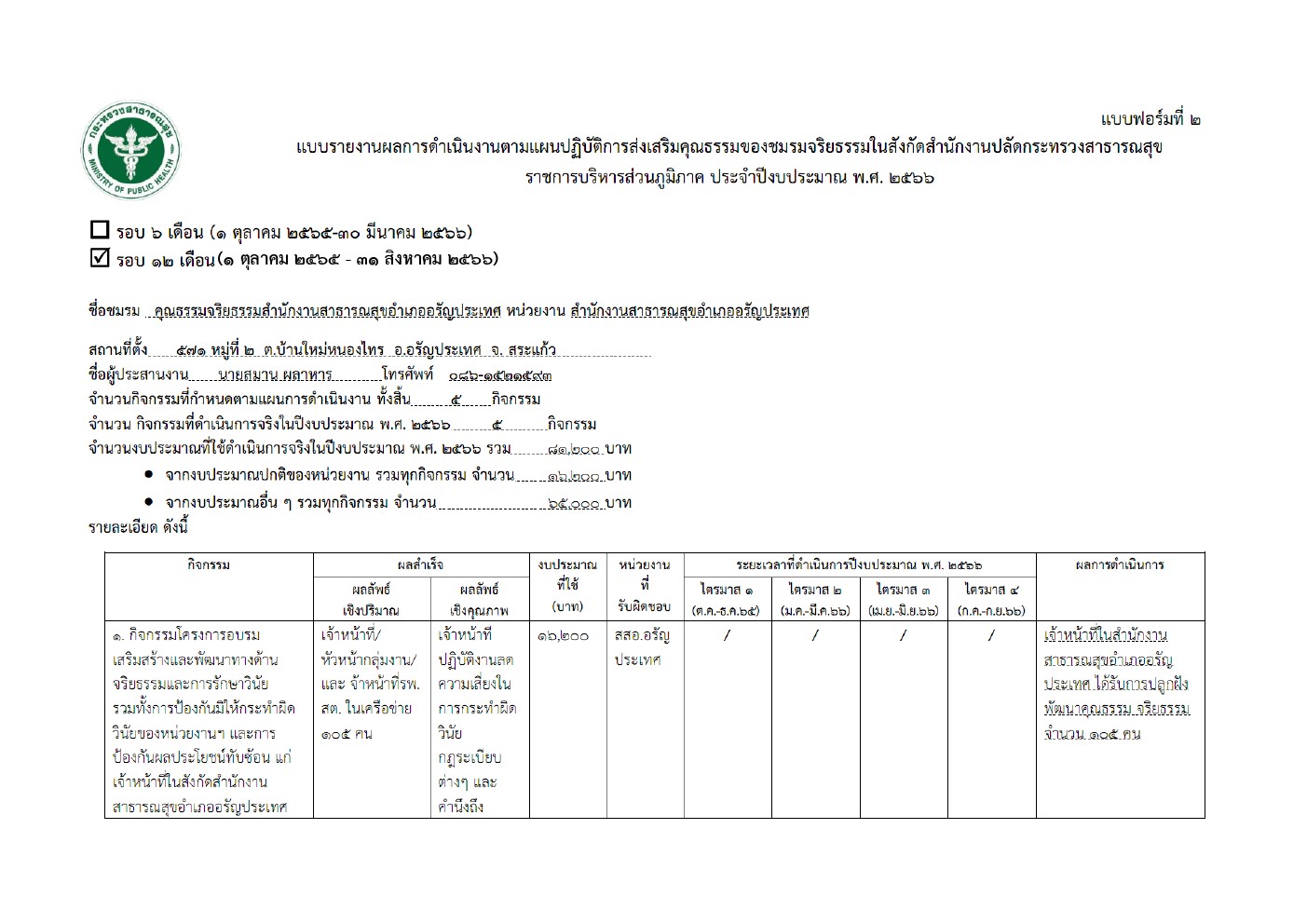 รายงานผลการดำเนินงานตามแผนปฏิบัติการส่งเสริมคุณธรรมจริยธรรม สำนักงานสาธารณสุขอำเภออรัญประเทศ